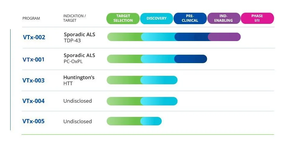 Amyotrophic lateral sclerosis, or ALS, is a fast-progressing neurodegenerative disease for which there is no cure. Current treatments have limited effect and a high unmet medical need remains with a life expectancy after diagnosis of just 3-5 years. We believe that antibody treatments have great potential for this condition. Therefore, we are developing VTx-002 and VTx-001 that has the potential to significantly delay disease progression and preserve quality of life in the vast majority of patients.